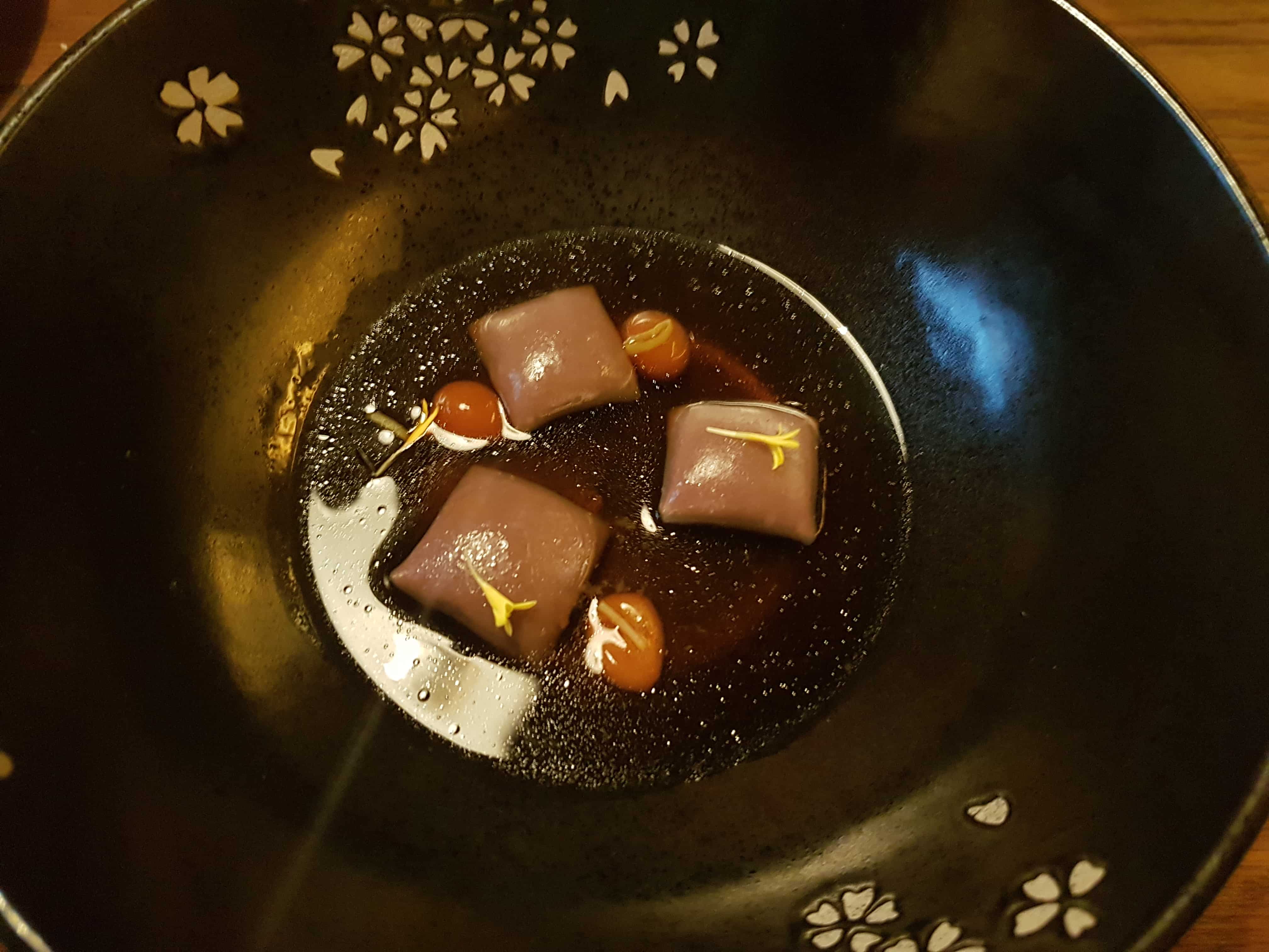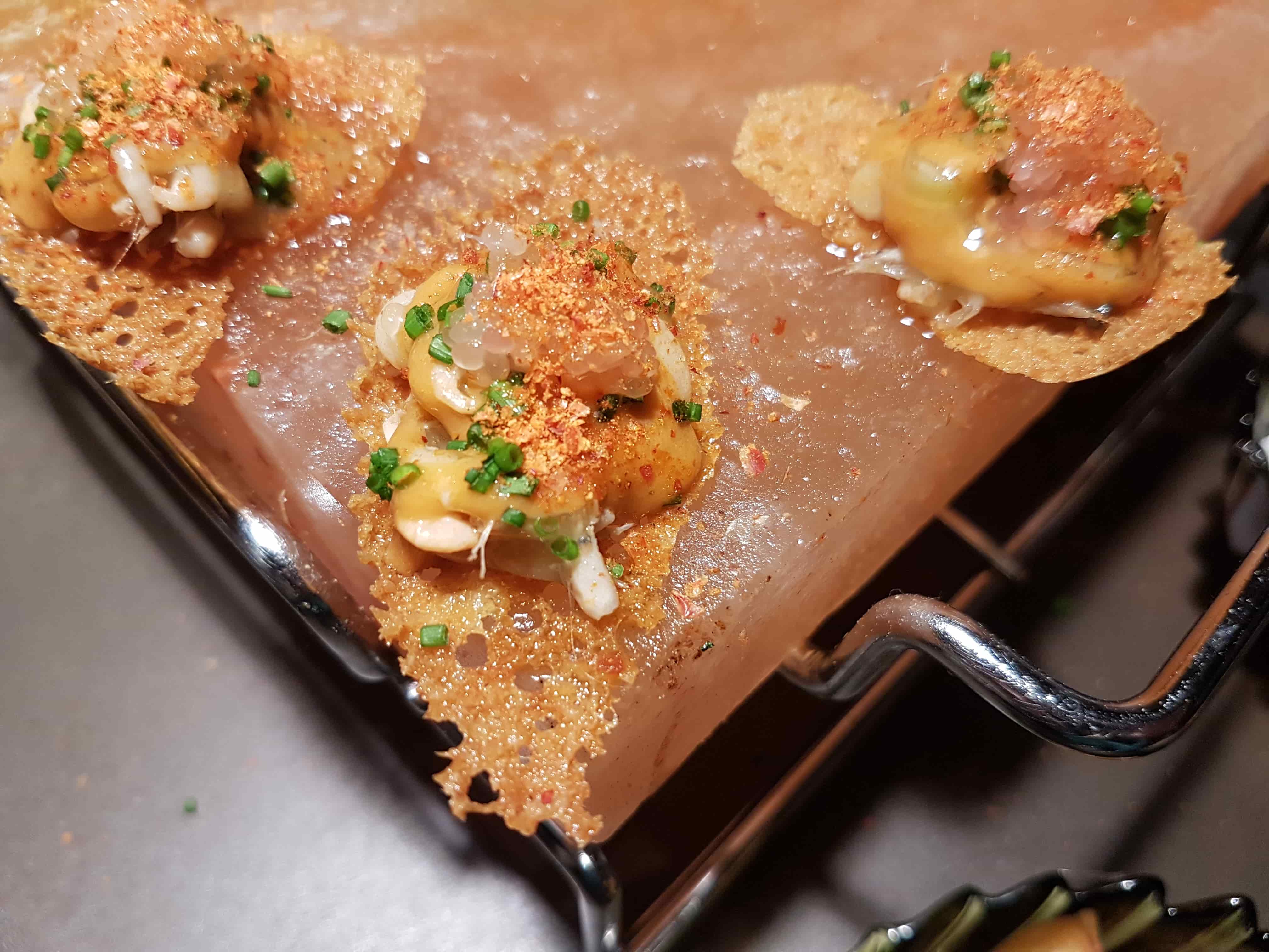 Empezamos con un telonero de excepción «Mack the Knife» de Bobby Darin en el bar de la entrada, unas Navajas al natural con Dashi de apio, leche de almendra y néctar de café. La presentación es espectacular, ya que vienen inmersas en unos vapores que se van disipando poco a poco y que nos va descubriendo el producto.