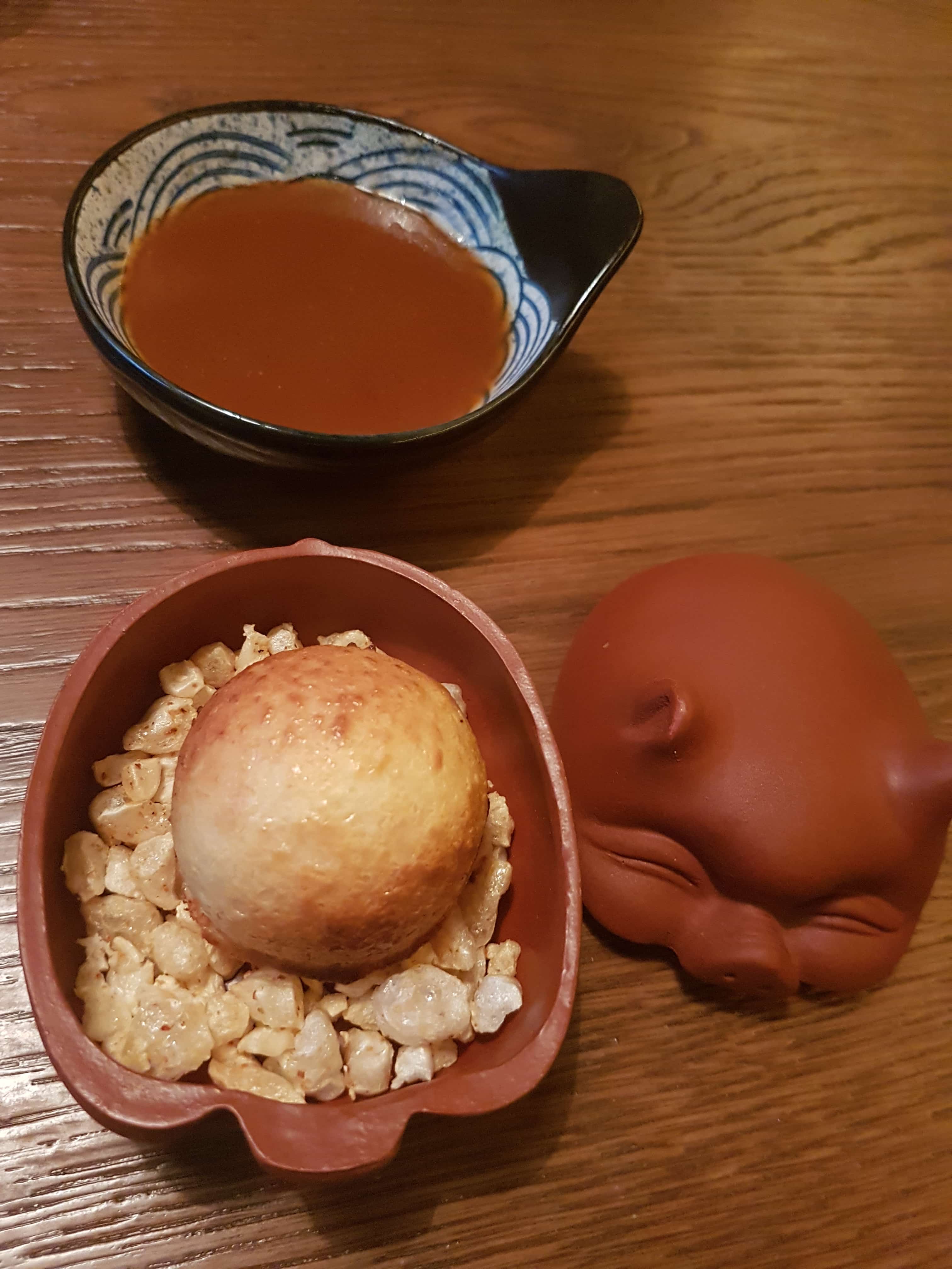 A continuación un temaZo, «Imagine», John Lenon, Crispy Pork Bun, traído de asia, una masa rellena de manitas de cerdo y tendones de ternera, cacahuetes, horneada, algo grasa y picante. La presentación esta cuidada al máximo.