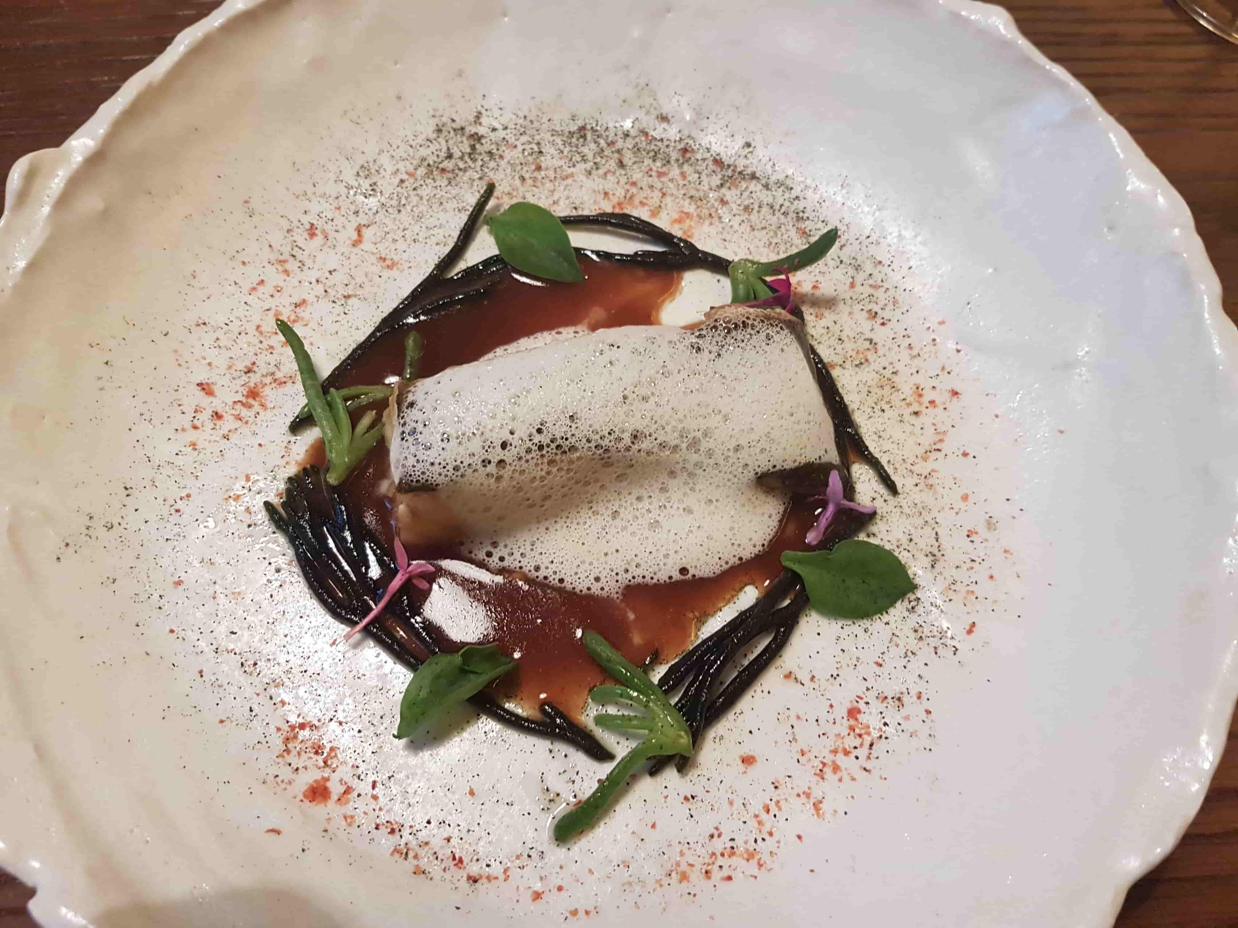 Pulpo a la llama y tomatillo, donde el pulpo aparece recubierto de una espuma.